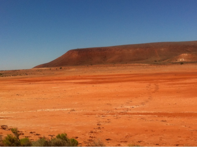 I thought the desert was going to be boring but worth the experience of long straight roads through flat nothingness. But it's so varied. We started off through scrub and small trees for about the first 50km then we past our first dried white lake beds and suddenly the small trees stopped and the horizon opened up. Scrub continued in its gorgeous blue green colour, so did the dead kangaroos (one being chewed by a fox) and the dead cows. We saw quite a few of these, their carcasses collapsing from the inside and their hides drying in the beating heat of the sun. Imagine hitting a cow! No thank you!
